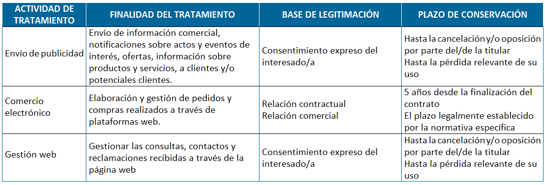 Detallamos a continuación las finalidades de los tratamientos de datos llevados a cabo por alguno, o todos, de los Responsables de Tratamiento enumerados con anterioridad.